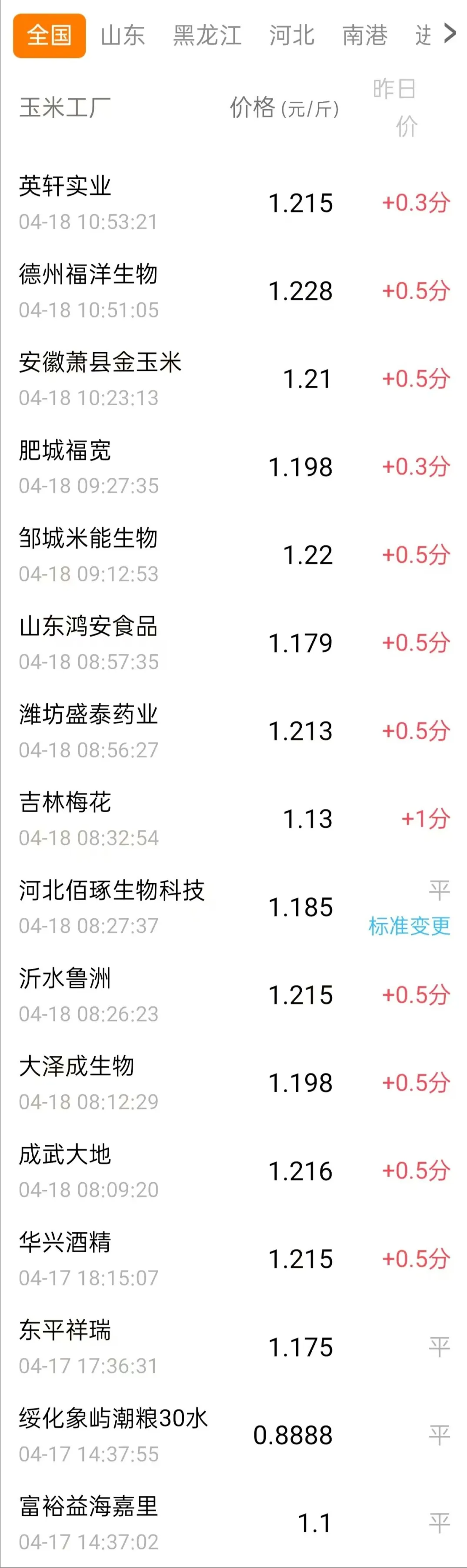 山东英轩实业上涨0.3分,1.215元;德州福洋上涨0.5分,1.228元;安徽萧县金玉米上涨0.5分,1.21元;肥城福宽上涨0.3分,1.198元;邹城熙来上涨0.5分,1.22元;山东鸿安食品上涨0.5分,1.179元;潍坊盛泰上涨0.5分,1.213元;吉林梅花上涨1分,1.13元;山东鲁洲上涨0.5分,1.215元;菏泽成武上涨0.5分,1.216元;大泽成生物上涨0.5分,1.198元;华兴酒精上涨0.5分,1.215元/斤!
