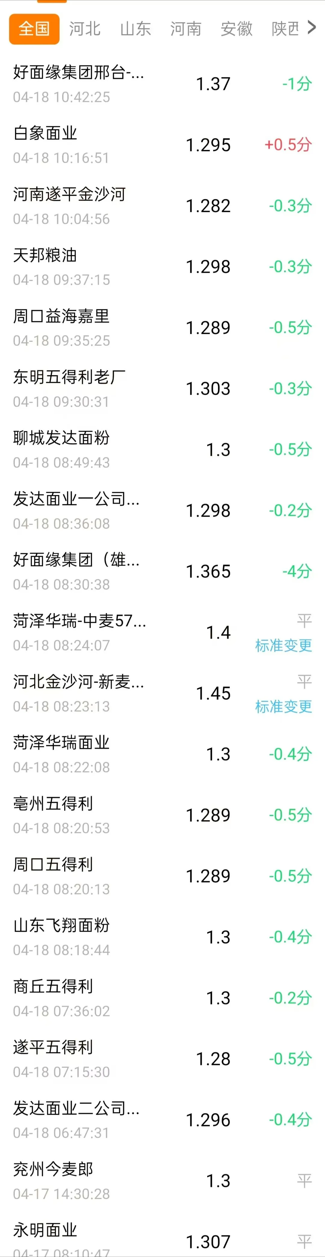 因此,在供需变化下,小麦行情承压!据数据分析,截至目前,全国小麦均价在1.294元/斤,深加工报价下跌现象增多!其中,白象面业上涨0.5分,1.295元/斤!下跌方面,邢台好面缘下跌1分,遂平金沙河下跌0.3分,1.282元;天邦粮油下跌0.3分,1.298元;周口益海嘉里下跌0.5分,1.289元;东明五得利下跌0.3分,1.303元;聊城发达面粉下跌0.5分,1.3元……
